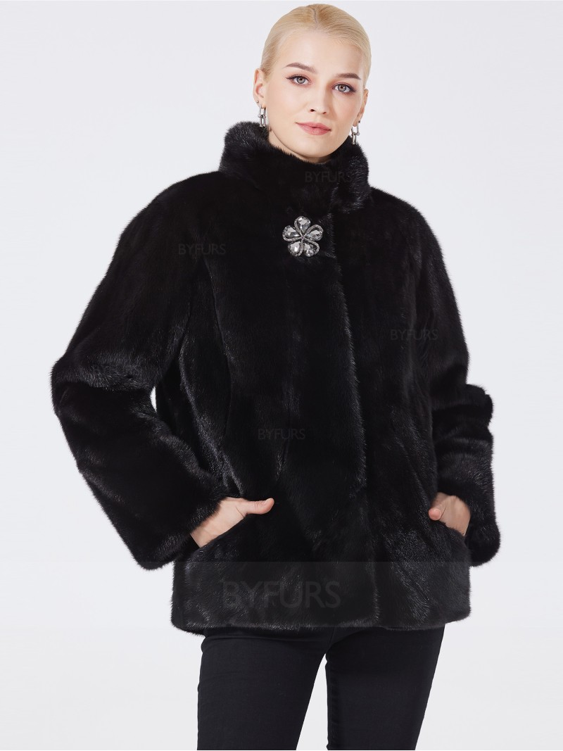 Chaqueta Femenina De Piel De Visón De Longitud Recortada Con Cuello Levantado Negro Y Ramillete